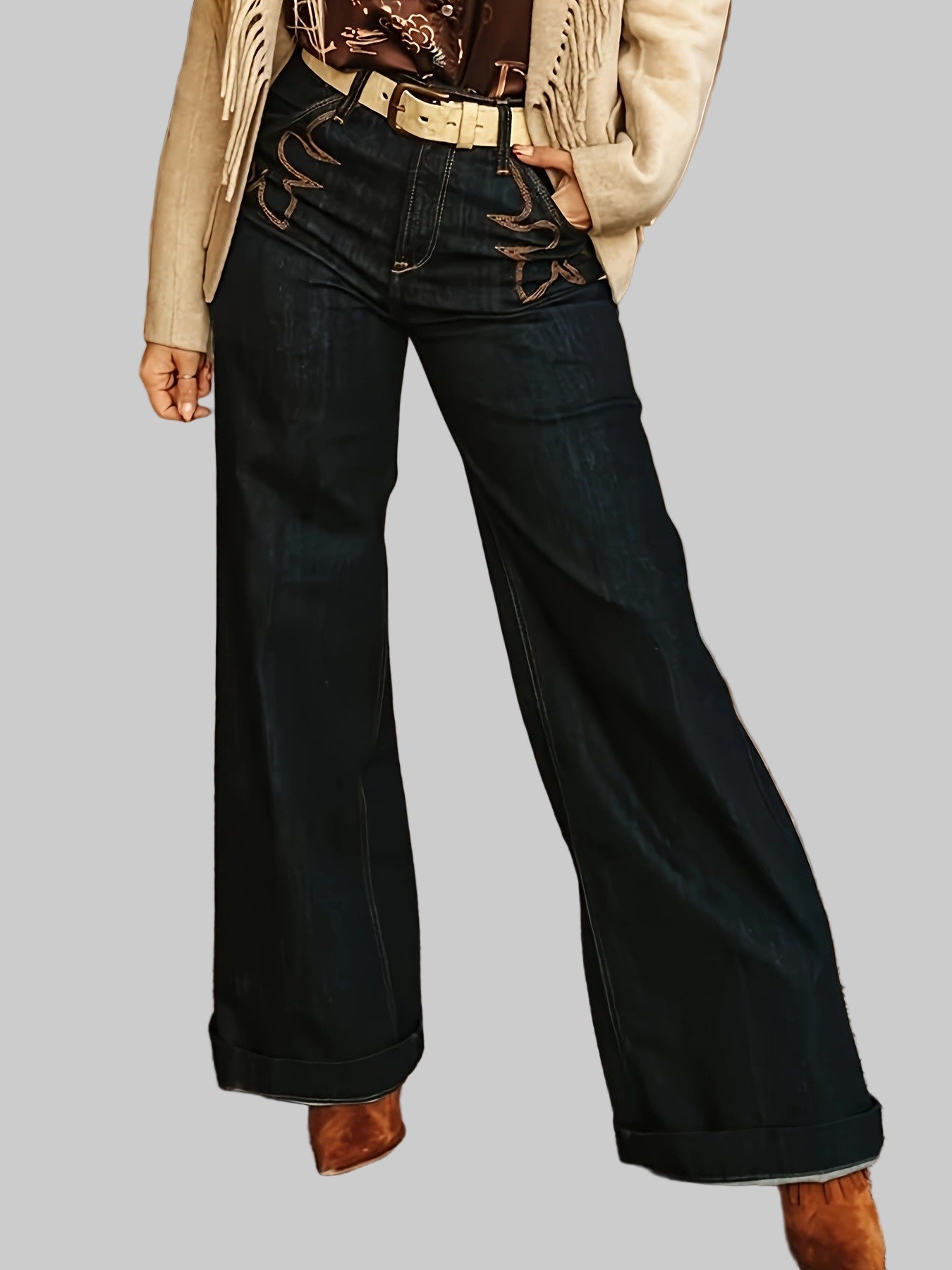 Damskie Jeansy o Szerokiej Nogawce z Haftem