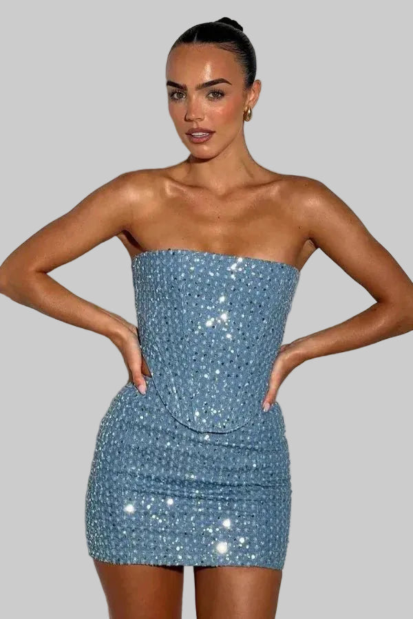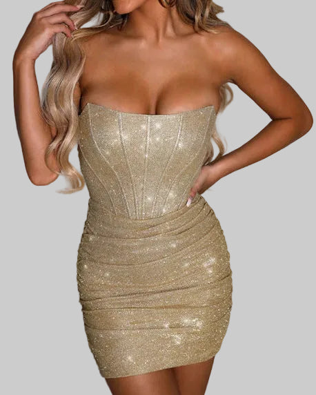 Damska Brokatowa Sukienka Mini bez Ramiączek z Gorsetową Górą i Marszczeniami